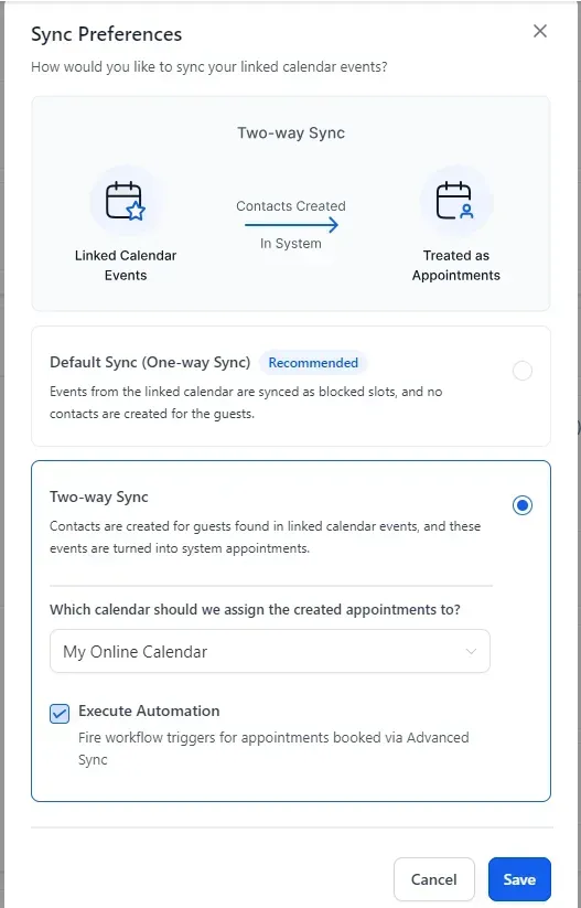 Enable 2-way sync to ensure real-time updates between your CRM and external calendars.
